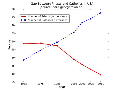 Gap tra Sacerdoti e Cattolici (fedeli) negli U.S.A. Rosso: numero di Sacerdoti (in migliaia) Blu: numero di fedeli cattolici (in milioni)