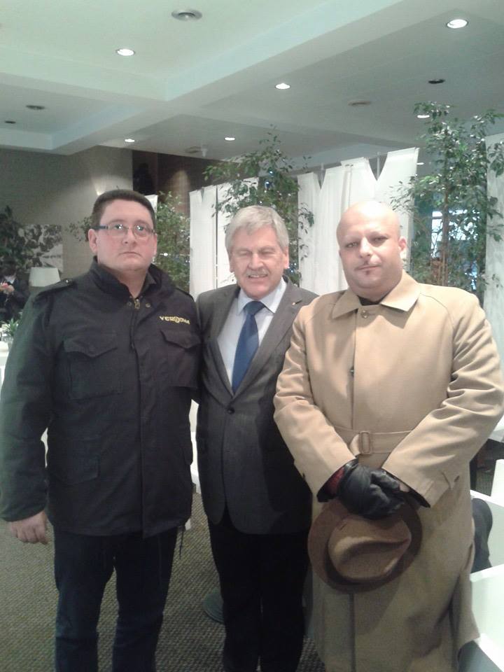 E ancora più severo è il giudizio di Udo Voigt, europarlamentare di Npd, (in foto tiene con fierezza la bandiera di “Christus Rex”) “dobbiamo proteggere l’Europa dall’immigrazione. Non vogliamo l’influsso di culture che non appartengono alla nostra tradizione. Io sono Cattolico e amo la mia Patria”. Con gli esponenti di “Christus Rex” ha notato simpaticamente che le nostre due bandiere, forse non a caso, hanno gli stessi colori (bianco e rosso) per un’Europa Cristiana, libera, indipendente dal liberal-sionismo, dal giogo degli USA e della NATO, delle banche e del mondialismo.
