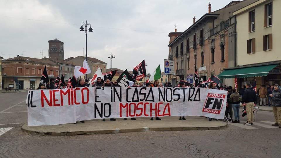 Le bandiere Vandeane sventolano accanto a quelle di FN alla Manifestazione contro l’edificazione di una nuova moschea a Bondeno (FE) e poi la foto di noi al banchetto presso il The Firm di Verona.