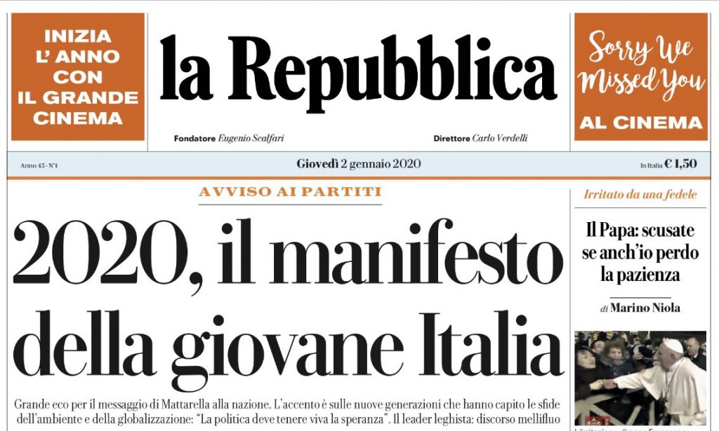 Quando il saluto di capodanno viene trasmesso a reti unificate, e praticamente tutti (anche in parte l’opposizione) lo trovano intelligente, profondissimo e di si sforzano di leggervi i sensi più profondi, e le direttive – anche i non detto – anzi Repubblica vi trova la direttiva futura, Il Manifesto della Giovane Italia